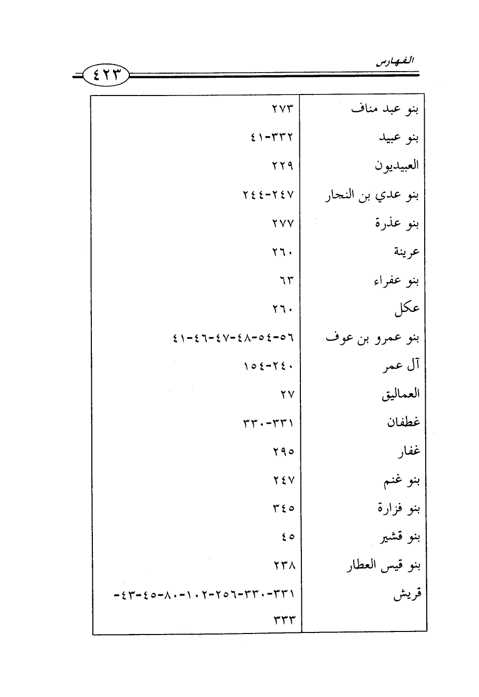 بنو عبد مناف 273 بنو عبيد 332 - 41 العبيديون 229 بنو عدي بن النجار 247 - 244 بنو عذرة 277 عرينة 260 بنو عفراء 63 عكل 260 بنو عمرو بن عوف 56 - 54 - 48 - 47 - 46 - 41 آل عمر 240 - 154 العماليق 27 غطفان 331 - 330 غفار 295 بنو غنم 247 بنو فزارة 345 بنو قشير 45 بنو قيس العطار 238 قريش 331 - 330 - 256 - 102 - 80 - 45 - 43 333…