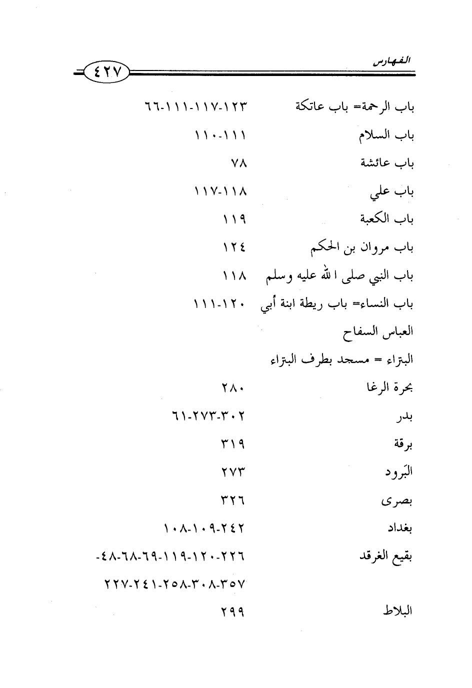 باب الرحمة = باب عاتكة 123 - 117 - 111 - 66 باب السلام 111 - 110 باب عائشة 78 باب علي 118 - 117 باب الكعبة 119 باب مروان بن الحكم 124 باب النبي صلى الله عليه وسلم 118 باب النساء = باب ريطة ابنة أبي 120 - 111 العباس السفاح البتراء = مسجد بطرف البتراء بحرة الرغا 280 بدر 302 - 273 - 61 برقة 319 البرود 273 بصرى 326 بغداد 242 - 109 - 108 بقيع الغرقد 226 - 120 - 119 - 69 - 68 - 48 357 - 308 - 258 - 241 - 227 البلاط 299…