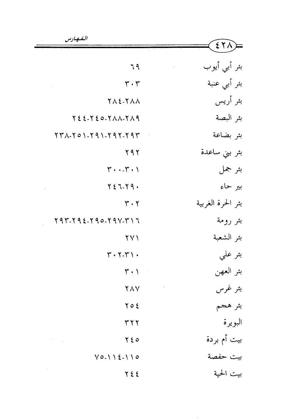 بئر أبي أيوب 69 بئر أبي عنبة 303 بئر أريس 288 - 284 بئر البصة 289 - 288 - 245 - 244 بئر بضاعة 293 - 292 - 291 - 251 - 238 بئر بني ساعدة 292 بئر جمل 301 - 300 بير حاء 290 - 246 بئر الحرة الغربية 302 بئر رومة 316 - 297 - 295 - 294 - 293 بئر الشعبة 271 بئر علي 310 - 302 بئر العهن 301 بئر غرس 287 بئر هجم 254 البويرة 322 بيت أم بردة 245 بيت حفصة 115 - 114 - 75 بيت الحية 244…