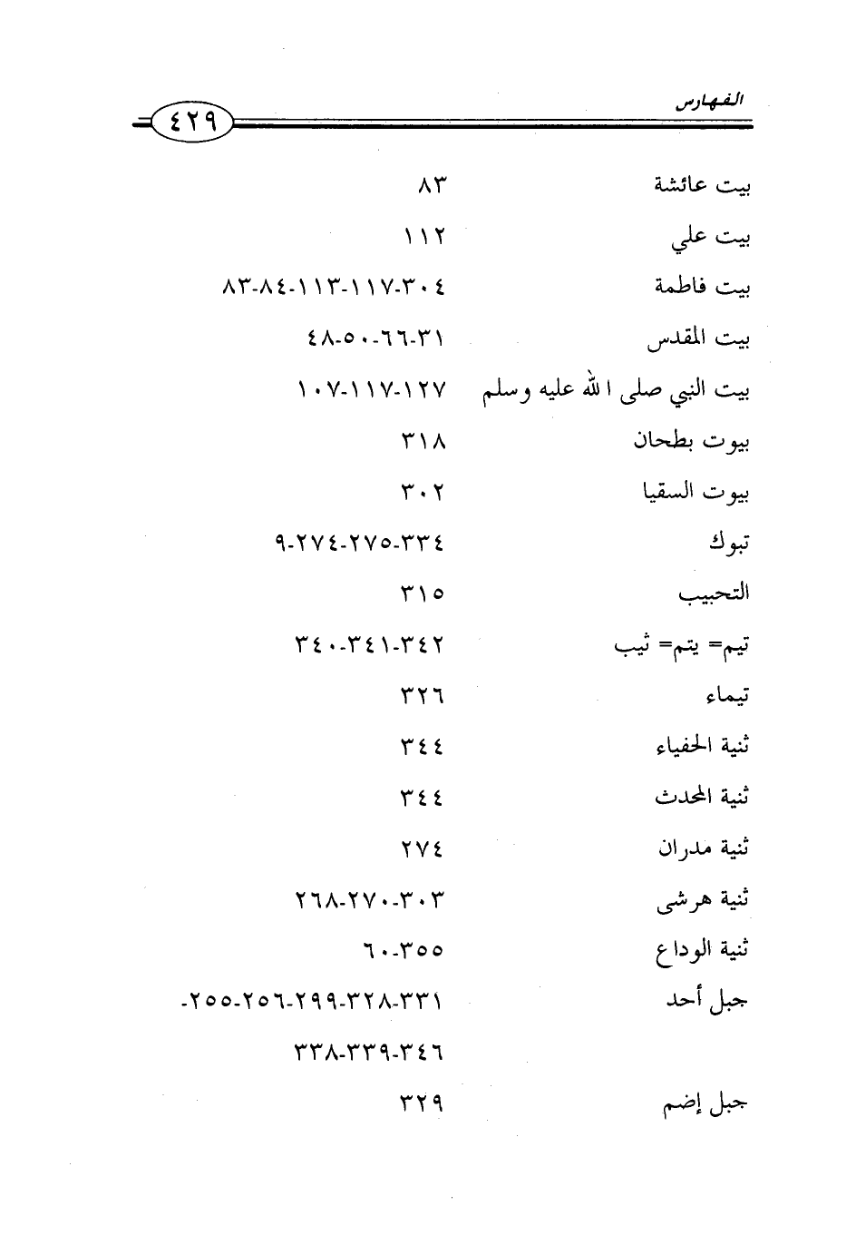 بيت عائشة 83 بيت علي 112 بيت فاطمة 304 - 117 - 113 - 84 - 83 بيت المقدس 31 - 66 - 50 - 48 بيت النبي صلى الله عليه وسلم 127 - 117 - 107 بيوت بطحان 318 بيوت السقيا 302 تبوك 334 - 275 - 274 - 9 التحبيب 315 تيم = يتم = ثيب 342 - 341 - 340 تيماء 326 ثنية الحفياء 344 ثنية المحدث 344 ثنية مدران 274 ثنية هرشى 303 - 270 - 268 ثنية الوداع 355 - 60 جبل أحد 331 - 328 - 299 - 256 - 255 346 - 339 - 338 جبل اضم 329…