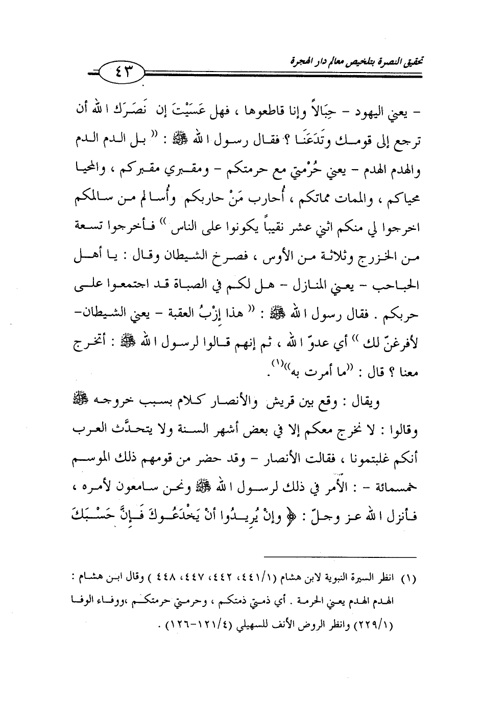 (1) انظر السيرة النبوية لابن هشام (1/ 441، 442، 447، 448) وقال ابن هشام: الهدم الهدم يعني الحرمة. أي ذمتي ذمتكم، وحرمتي حرمتكم، ووفاء الوفا (1/ 229) وانظر الروض الأنف للسهيلي (4/ 121 - 126).