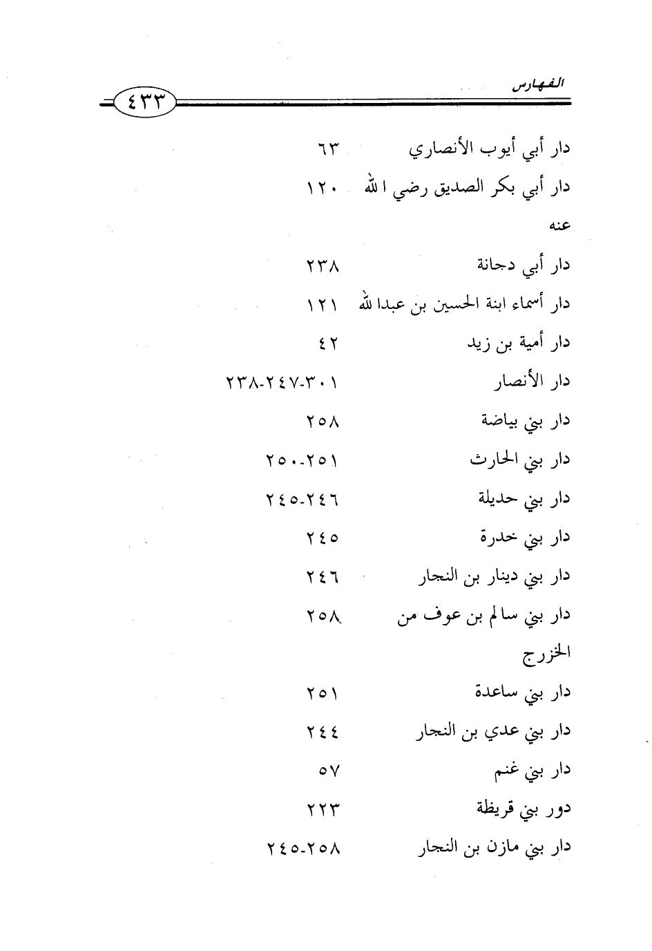 دار أبي أيوب الأنصاري 63 دار أبي بكر الصديق رضي الله 120 عنه دار أبي دجانة 238 دار أسماء ابنة الحسين بن عبد الله 121 دار أمية بن زيد 42 دار الأنصار 301 - 247 - 238 دار بني بياضة 258 دار بني الحارث 251 - 250 دار بني حديلة 246 - 245 دار بني خدرة 245 دار بني دينار بن النجار 246 دار بني سالم بن عوف من 258 الخزرج دار بني ساعدة 251 دار بني عدي بن النجار 244 دار بني عنم 57 دور بني قريظة 223 دار بني مازن بن النجار 258 - 245…