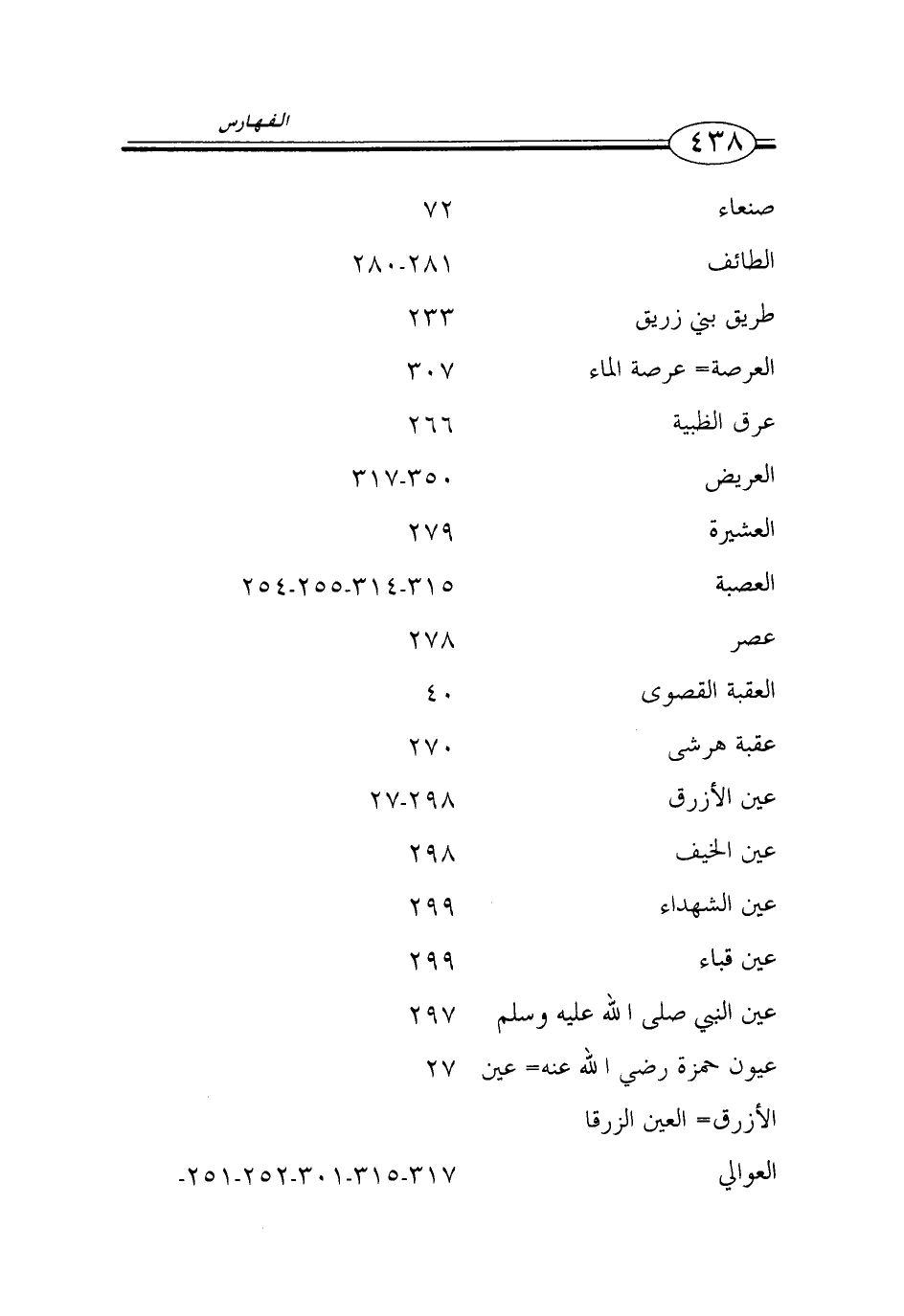 صنعاء 72 الطائف 281 - 280 طريق بني زريق 233 العرصة = عرصة الماء 307 عرق الظبية 266 العريض 350 - 317 العشيرة 279 العصبة 315 - 314 - 255 - 254 عصر 278 العقبة القصوى 40 عقبة هرشى 270 عين الأزرق 298 - 27 عين الخيف 298 عين الشهداء 299 عين قباء 299 عين النبي صلى الله عليه وسلم 297 عيون حمزة رضي الله عنه = عين 27 الأزرق = العين الزرقا العوالي 317 - 315 - 301 - 252 - 251 - …