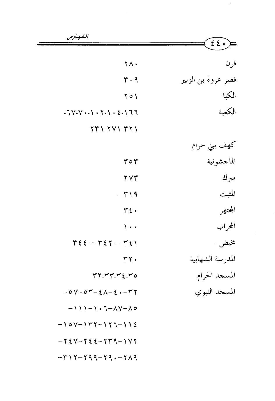قرن 280 قصر عروة بن الزبير 309 الكبا 251 الكعبة 166 - 104 - 102 - 70 - 67 321 - 271 - 231 كهف بني حرام الماجشونية 353 مبرك 273 المثبت 319 المجتهر 340 المحراب 100 مخيض 341 - 342 - 344 المدرسة الشهابية 320 المسجد الحرام 35 - 34 - 33 - 32 المسجد النبوي 32 - 40 - 48 - 53 - 57 85 - 87 - 106 - 111 114 - 126 - 132 - 157 172 - 239 - 244 - 247 289 - 290 - 299 - 312…