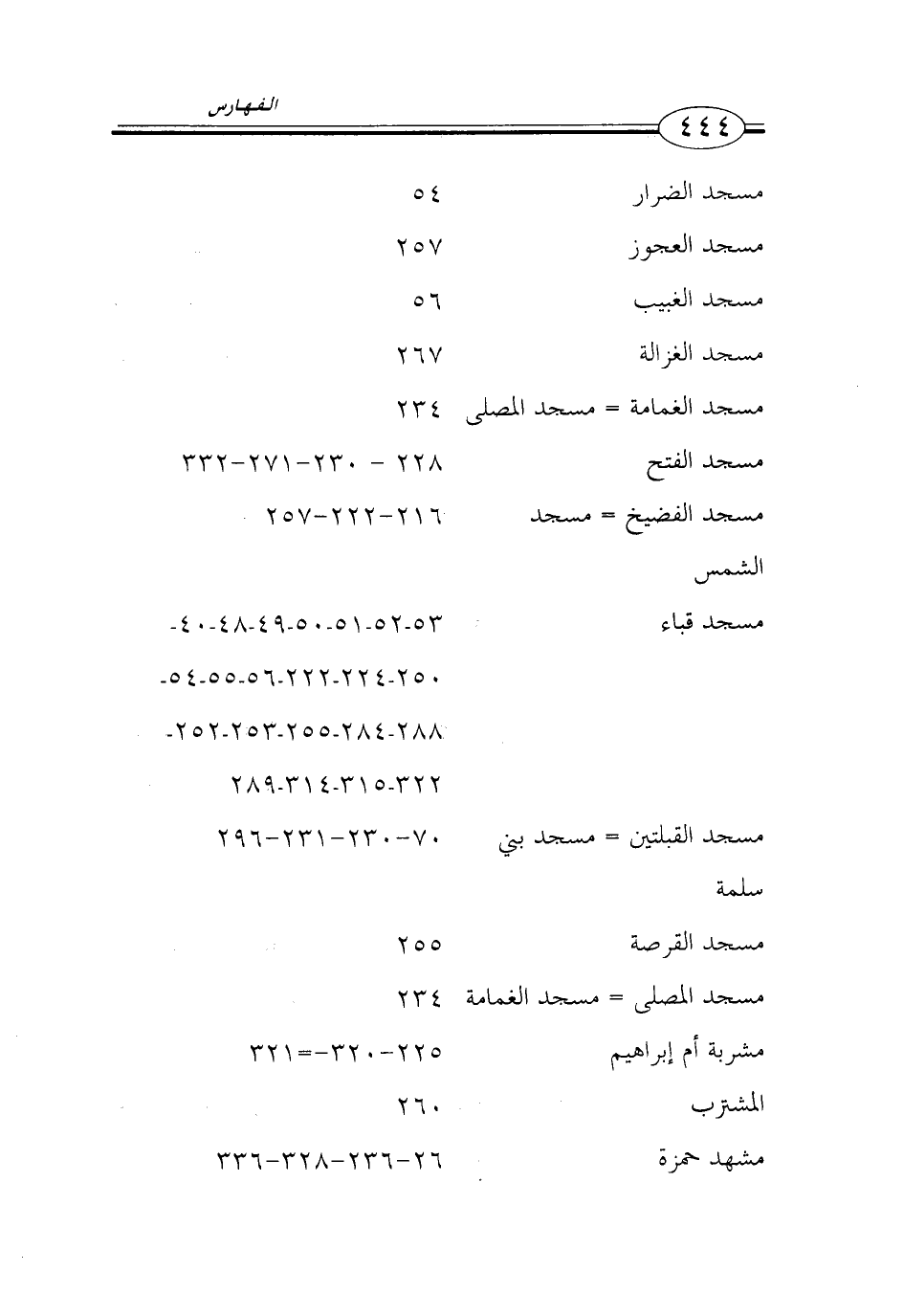 مسجد الضرار 54 مسجد العجوز 257 مسجد الغبيب 56 مسجد الغزالة 267 مسجد الغمامة = مسجد المصلى 234 مسجد الفتح 228 - 230 - 271 - 332 مسجد الفضيخ = مسجد 216 - 222 - 257 الشمس مسجد قباء 53 - 52 - 51 - 50 - 49 - 48 - 40 250 - 224 - 222 - 56 - 55 - 54 288 - 284 - 255 - 253 - 252 322 - 315 - 314 - 289 مسجد القبلتين = مسجد بني 70 - 230 - 231 - 296 سلمة مسجد القرصة 255 مسجد المصلى = مسجد الغمامة 234 مشربة أم ابراهيم 225 - 320 - = 321 المشترب 260 مشهد حمزة 26 - 236 - 328 - 336 - …