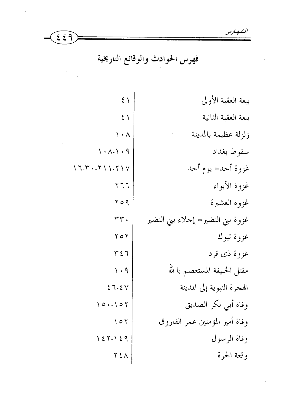 بيعة العقبة الأولى 41 بيعة العقبة الثانية 41 زلزلة عظيمة بالمدينة 108 سقوط بغداد 109 - 108 غزوة أحد = يوم أحد 217 - 211 - 30 - 16 غزوة الأبواء 266 غزوة العشيرة 259 غزوة بني النضير = اجلاء بني النضير 330 غزوة تبوك 252 غزوة ذي قرد 346 مقتل الخليفة المستعصم بالله 109 الهجرة النبوية إلى المدينة 47 - 46 وفاة أبي بكر الصديق 152 - 150 وفاة أمير المؤمنين عمر الفاروق 152 وفاة الرسول 149 - 142 وقعة الحرة 248…