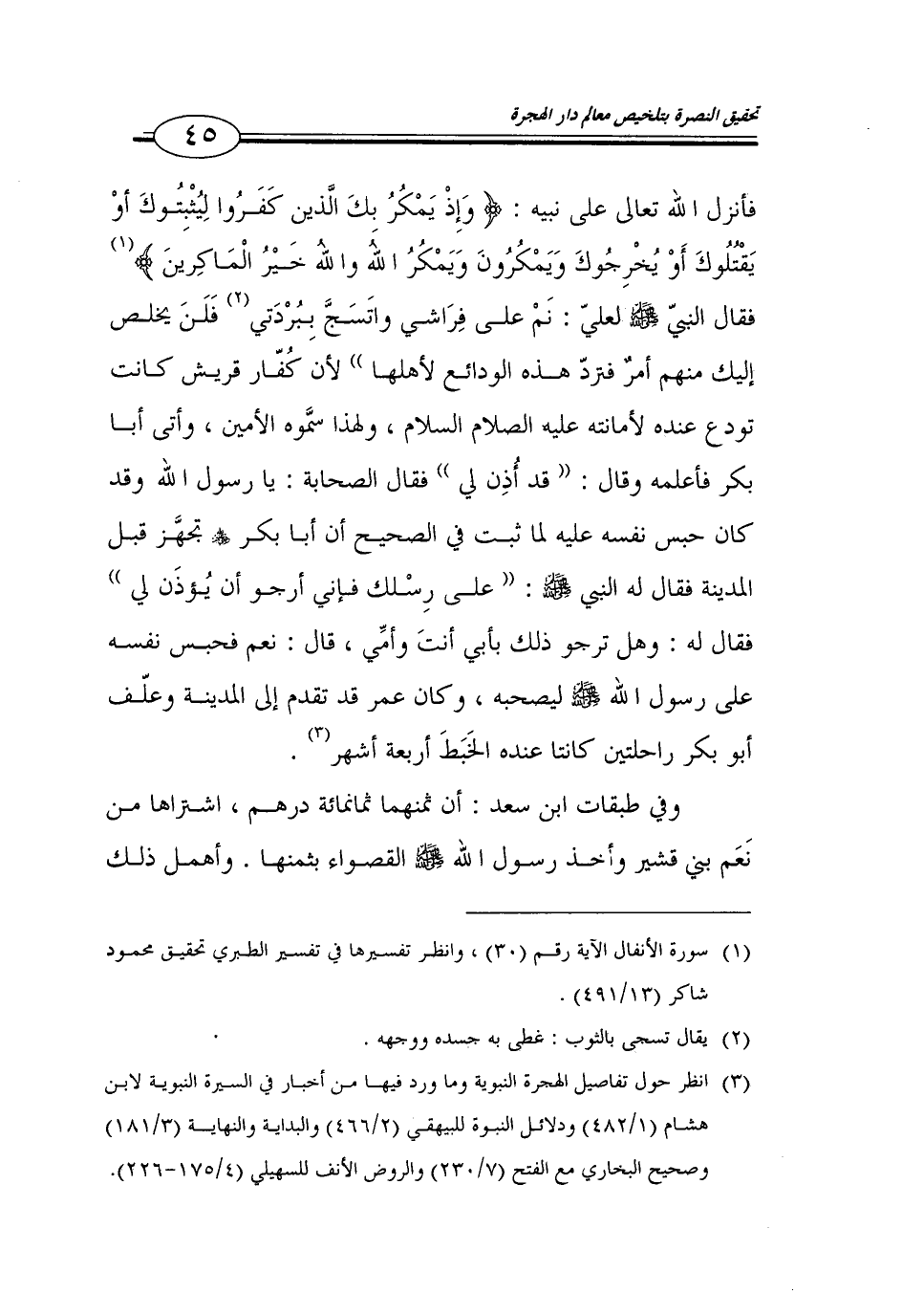 (3) انظر حول تفاصيل الهجرة النبوية وما ورد فيها من أخبار في السيرة النبوية لابن هشام (1/ 482) ودلائل النبوة للبيهقي (2/ 466) والبداية والنهاية (3/ 181) وصحيح البخاري مع الفتح (7/ 230) والروض الأنف للسهيلي (4/ 175 - 226).