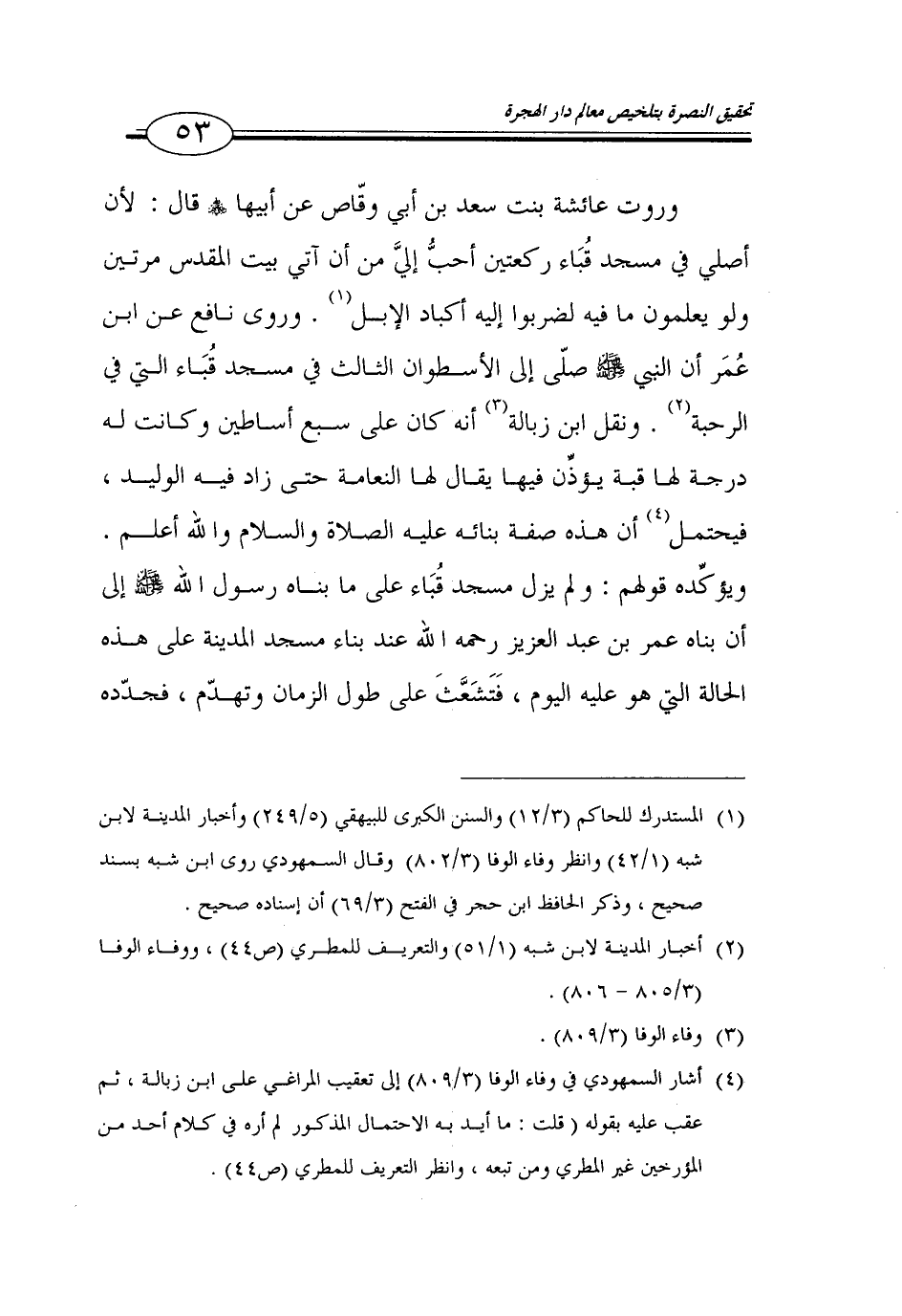 (1) المستدرك للحاكم (3/ 12) والسنن الكبرى للبيهقي (5/ 249) وأخبار المدينة لابن شبه (1/ 42) وانظر وفاء الوفا (3/ 803) وقال السمهودي روى ابن شبه بسند صحيح، وذكر الحافظ ابن حجر في الفتح (3/ 69) أن اسناده صحيح.