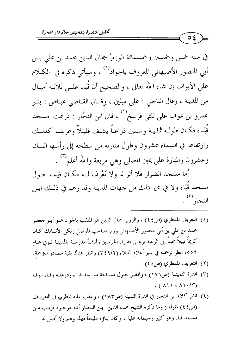 (1) التعريف للمطري (ص44)، والوزير جمال الدين هو الملقب بالجواد هو أبو جعفر محمد بن علي بن أبي منصور الأصبهاني وزير صاحب الموصل زنكي الأتايك كان كريماً نبيلاً محبباً إلى الرعية يرعى فقراء الحرمين وأنشأ مدرسة بالمدينة توفي عام 559، انظر ترجمته في سير أعلام النبلاء (2/ 349) وانظر هناك بقية مصادر الترجمة.