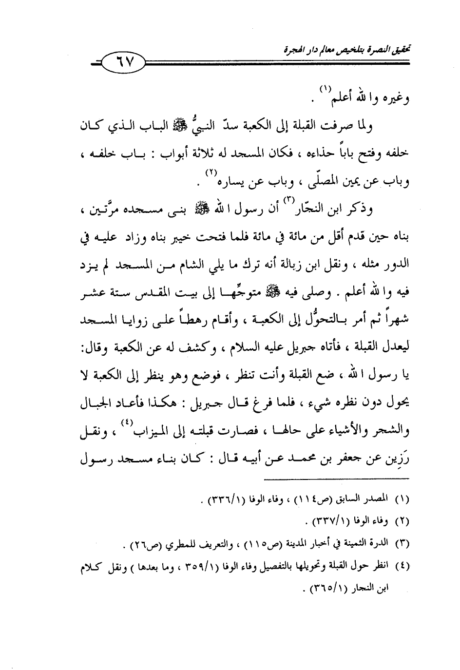 (4) انظر حول القبلة وتحويلها بالتفصيل وفاء الوفا (1/ 359، وما بعدها) ونقل كلام ابن النجار (1/ 365).