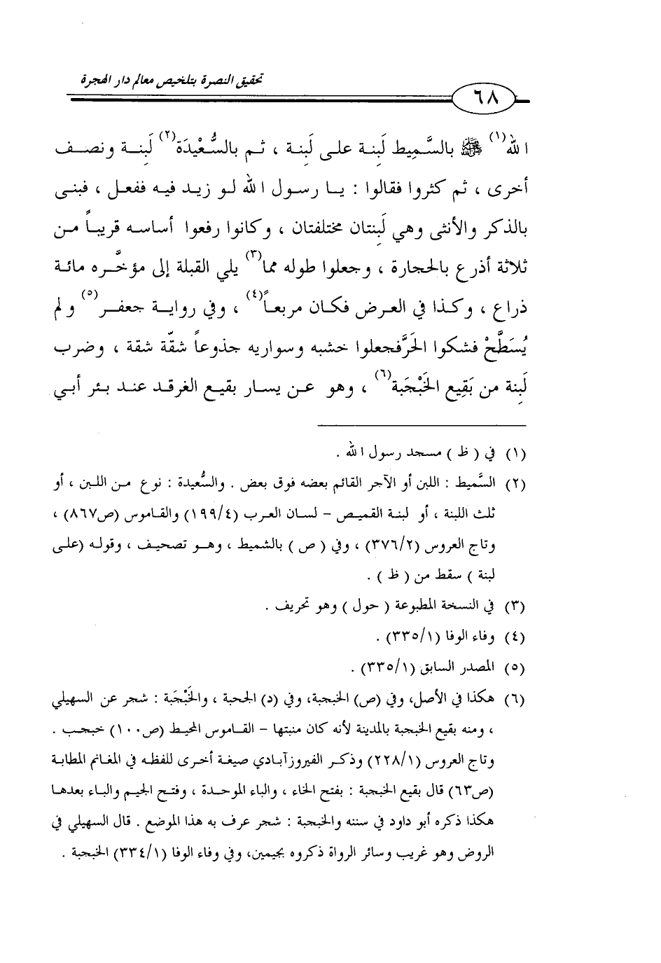 وتاج العروس (1/ 228) وذكر الفيروزآبادي صيغة أخرى للفظه في المغانم المطابة (ص63) قال بقيع الخبجبة: بفتح الخاء، والباء الموحدة، وفتح الجيم والباء بعدها هكذا ذكره أبو داود في سننه والخبجبة: شجر عرف به لهذا الموضع. قال السهيلي في الروض وهو غريب وسائر الرواة ذكروه بجيمين، وفي وفاء الوفا (1/ 334) الخبجبة.