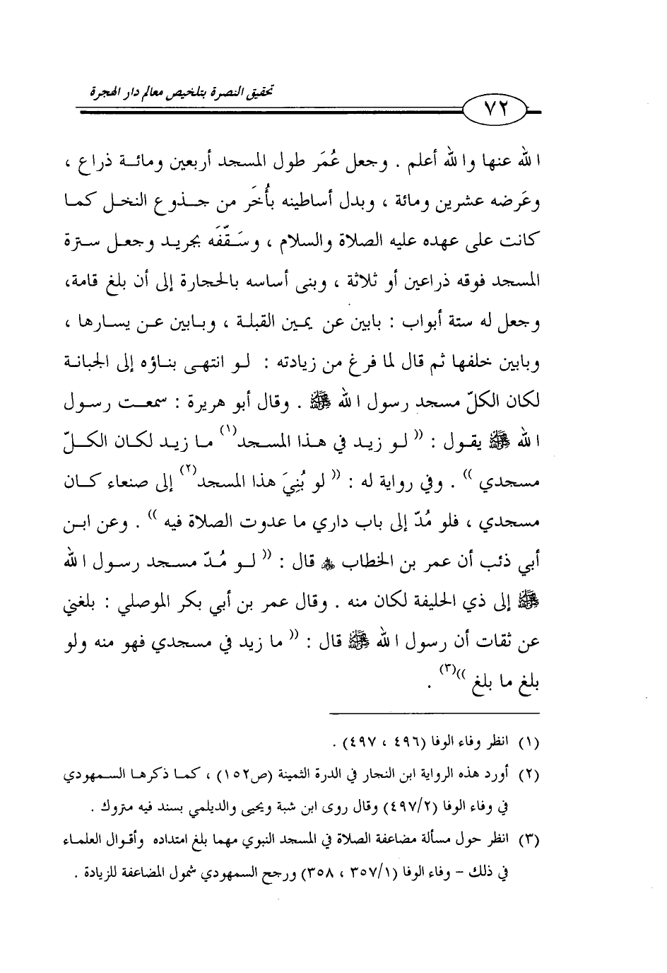 (3) انظر حول مسألة مضاعفة الصلاة في المسجد النبوي مهما بلغ امتداده وأقوال العلماء في ذلك - وفاء الوفا (1/ 357، 358) ورجح السمهودي شمول المضاعفة للزيادة.
