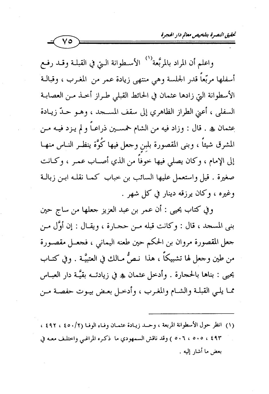 75…واعلم أن المراد بالمربعة (1) الأسطوانة التي في القبلة وقد رفع أسفلها مربعاً قدر الجلسة وهي منتهى زيادة عمر من المغرب، وقبالة الأسطوانة التي زادها عثمان في الحائط القبلي طراز أخذ من العصابة السفلى، أعني الطراز الظاهري إلى سقف المسجد، وهو حد زيادة عثمان قال: وزاد فيه من الشام خمسين ذراعاً ولم يزد فيه من المشرق شيئاً، وبنى المقصورة بلبن وجعل فيها كوة ينظر الناس منها إلى الإمام، وكان يصلي فيها خوفاً من الذي أصاب عمر، وكانت صغيرة.