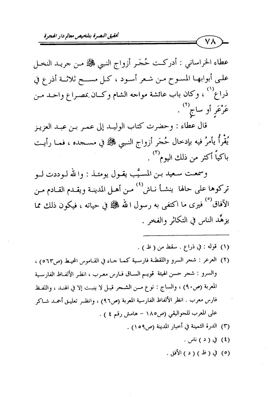 وسمعت سعيد بن المسيب يقول يومئذ: والله لوددت لو تركوها على حالها ينشأ ناش (4) من أهل المدينة ويقدم القادم من الآفاق (5) فيرى ما اكتفى به رسول الله صلى الله عليه وسلم في حياته، فيكون ذلك مما يزهد الناس في التكاثر والفخر.