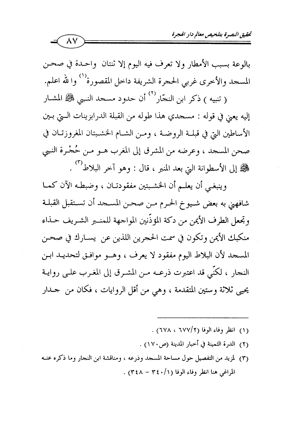 (3) لمزيد من التفصيل حول مساحة المسجد وذرعه، ومناقشة ابن النجار وما ذكره عنه المراغي هنا انظر وفاء الوفا (1/ 340 - 348).