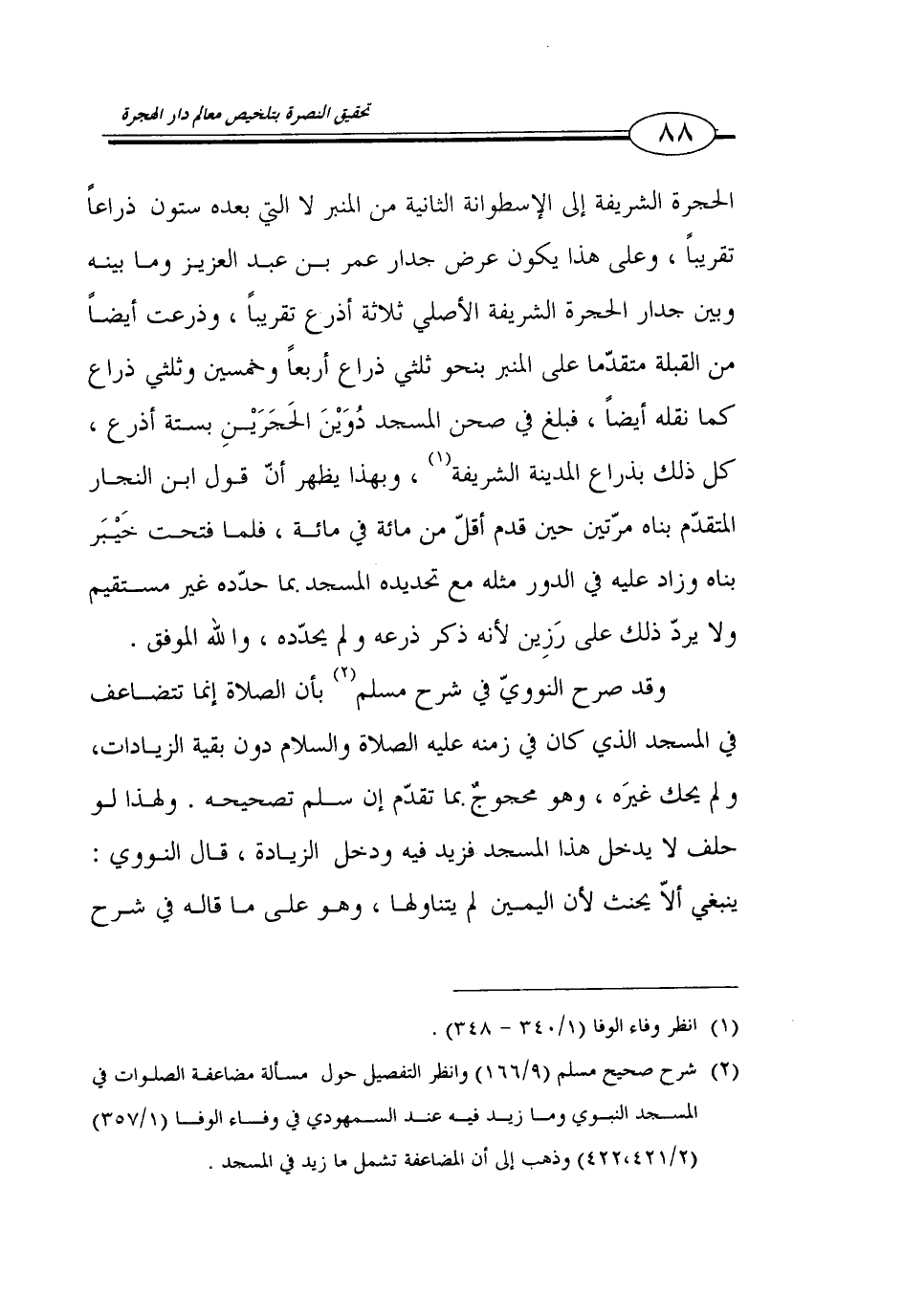 الحجرة الشريفة إلى الاسطوانة الثانية من المنبر لا التي بعده ستون ذراعاً تقريباً، وعلى هذا يكون عرض جدار عمر بن عبد العزيز وما بينه وبين جدار الحجرة الشريفة الأصلي ثلاثة أذرع تقريباً، وذرعت ايضاً من القبلة متقدما على المنبر بنحو ثلثي ذراع أربعاً وخمسين وثلثي ذراع كما نقله أيضاً، فبلغ في صحن المسجد دوين الحجرين بستة أذرع، كل ذلك بذراع المدينة الشريفة (1)، وبهذا يظهر أن قول ابن النجار المتقدم بناه مرتين حين قدم أقل من مائة في مائة، فلما فتحت خيبر بناه وزاد عليه في الدور مثله مع تحديده المسجد بما حدده غير مستقيم ولا يرد ذلك على رزين لأنه ذكر ذرعه ولم يحدده، والله الموفق.