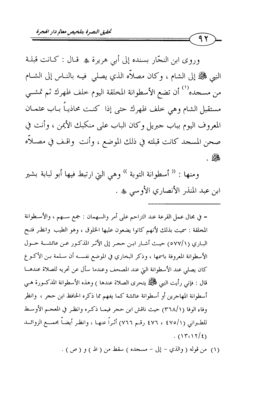 92…وروى ابن النجار بسنده إلى أبي هريرة رضي الله عنه قال: كانت قبلة النبي صلى الله عليه وسلم إلى الشام، وكان مصلاه الذي يصلي فيه بالناس إلى الشام من مسجده (1) ان تضع الاسطوانة المخلقة اليوم خلف ظهرك ثم تمشي مستقبل الشام وهي خلف ظهرك حتى اذا كنت محاذياً باب عثمان المعروف اليوم بباب جبريل وكان الباب على منكبك الايمن، وانت في صحن المسجد كانت قبلته في ذلك الموضع، وانت واقف في مصلاه صلى الله عليه وسلم.