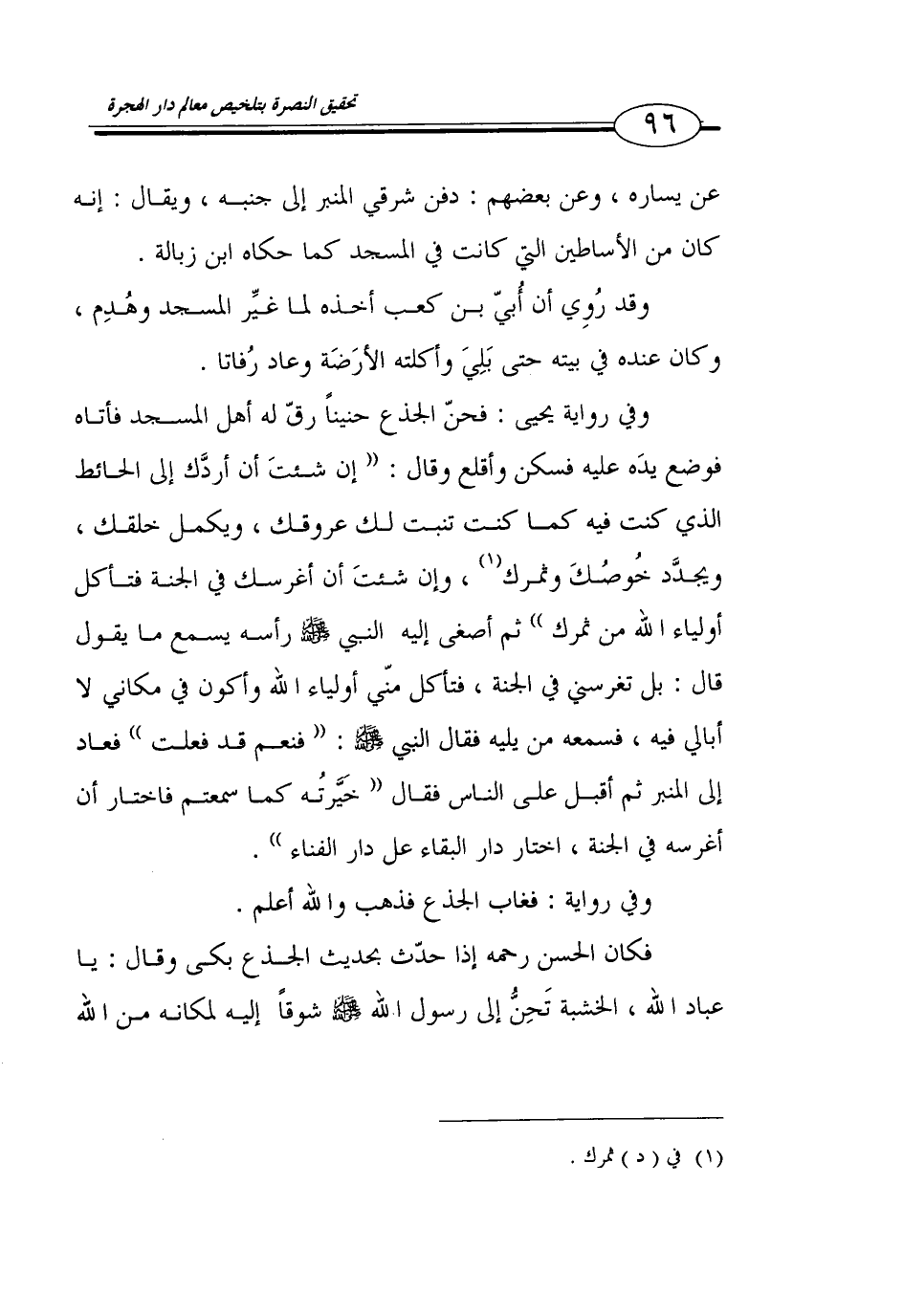 وفي رواية يحيى: فحن الجذع حنينا رق له اهل المسجد فاتاه فوضع يده عليه فسكن واقلع وقال: ((ان شئت ان اردك إلى الحائط الذي كنت فيه كما كنت تنبت لك عروقك، ويكمل خلقك، ويجدد خوصك وثمرك (1)، وان شئت ان اغرسك في الجنة فتاكل اولياء الله من ثمرك)) ثم اصغى اليه النبي صلى الله عليه وسلم راسه يسمع ما يقول قال: بل تغرسني في الجنة، فتاكل مني اولياء الله واكون في مكاني لا ابالي فيه، فسمعه من يليه فقال النبي صلى الله عليه وسلم: ((فنعم قد فعلت)) فعاد إلى المنبر ثم اقبل على الناس فقال ((خيرته كما سمعتم فاختار ان اغرسه في الجنة، اختار دار البقاء على دار الفناء)).