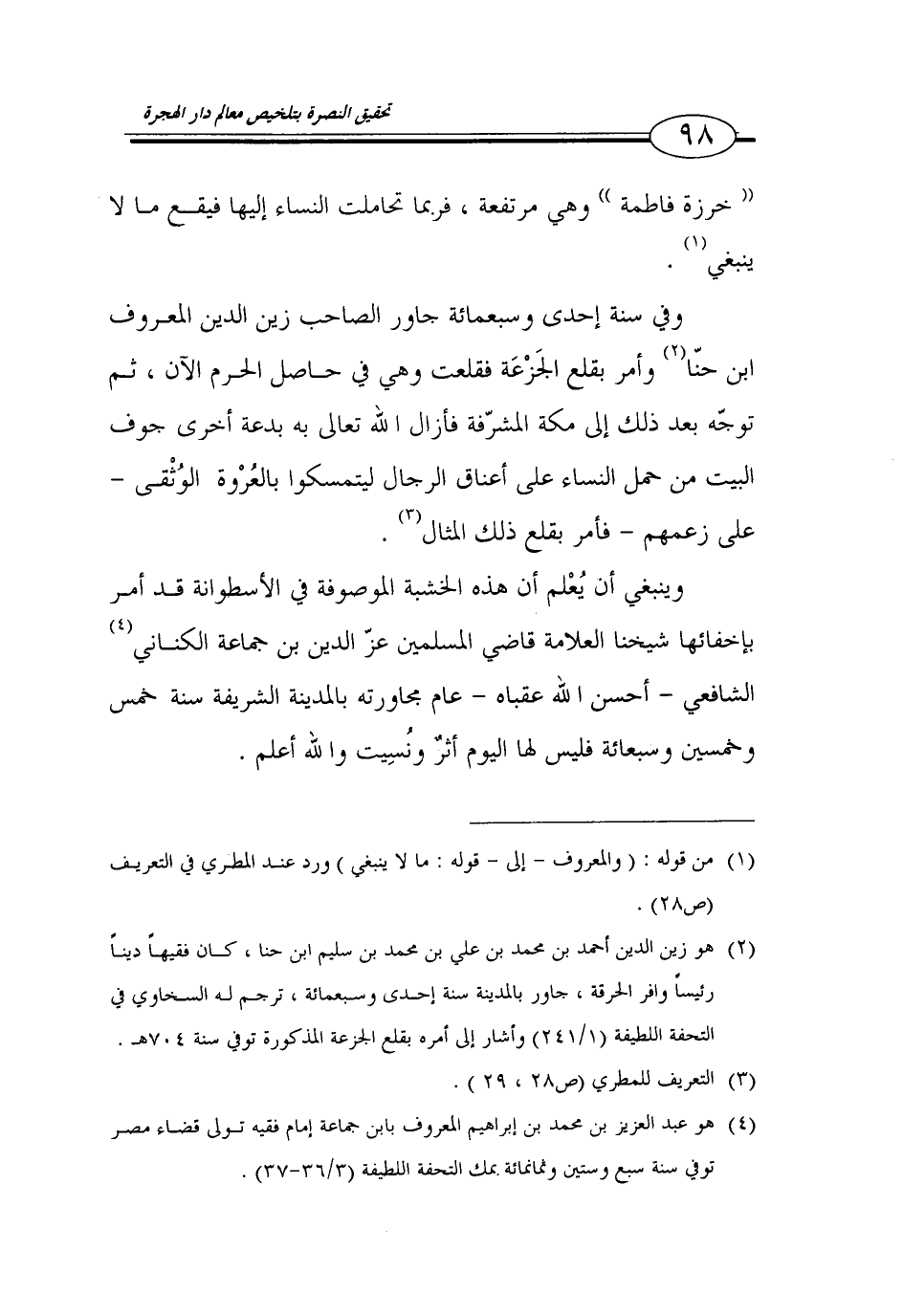 (2) هو زين الدين أحمد بن محمد بن علي بن محمد بن سليم ابن حنا، كان فقيها دينا رئيساً وافر الحرقة، جاور بالمدينة سنة احدى وسبعمائة، ترجم له السخاوي في التحفة اللطيفة (241/ 1) واشار إلى امره بقلع الجزعة المذكورة توفي سنة 704هـ.