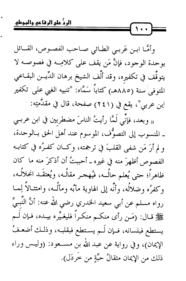 وأمَّا ابن عَربي الطائي صاحب الفصوص، القائل بوحدة الوجود، فإنَّ مَن يقف على كلامِه في فصوصه لا يتوقَّف في تكفيرِه، وقد ألَّف الشيخ برهان الدِّين البقاعي المتوفى سنة (885هـ) كتاباً سَمَّاه: "تنبيه الغبي على تكفير ابن عربي"، يقع في (241) صفحة، قال في مقدِّمتِه: