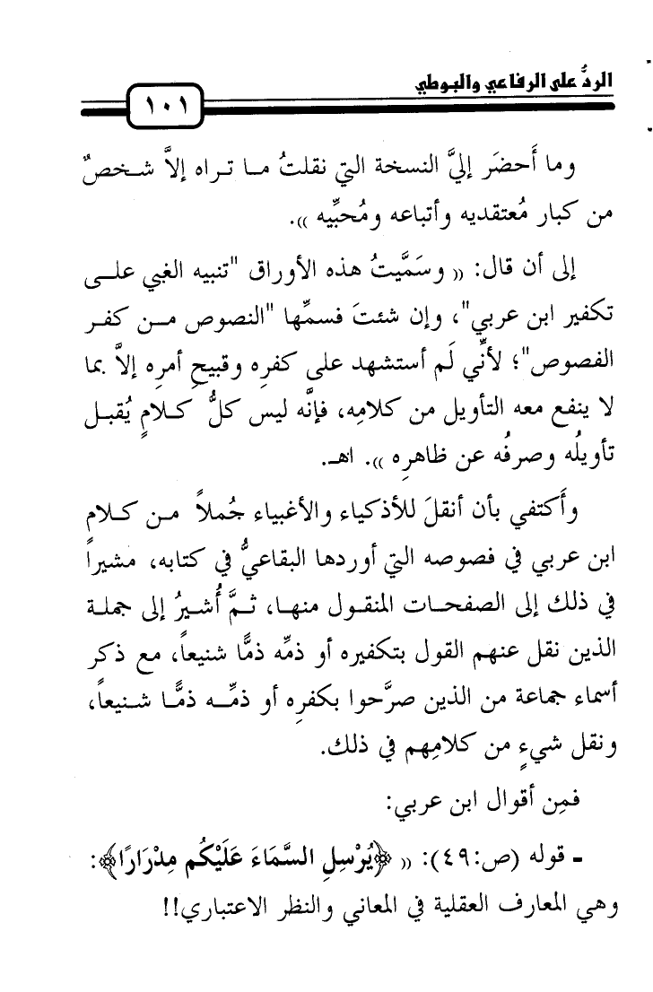 وأَكتفي بأن أنقلَ للأذكياء والأغبياء جُملاً من كلام ابن عربي في فصوصه التي أوردها البقاعيُّ في كتابه، مشيراً في ذلك إلى الصفحات المنقول منها، ثمَّ أُشيرُ إلى جملة الذين نقل عنهم القول بتكفيره أو ذمِّه ذمًّا شنيعاً، مع ذكر أسماء جماعة من الذين صرَّحوا بكفرِه أو ذمِّه ذمًّا شنيعاً، ونقل شيءٍ من كلامِهم في ذلك.