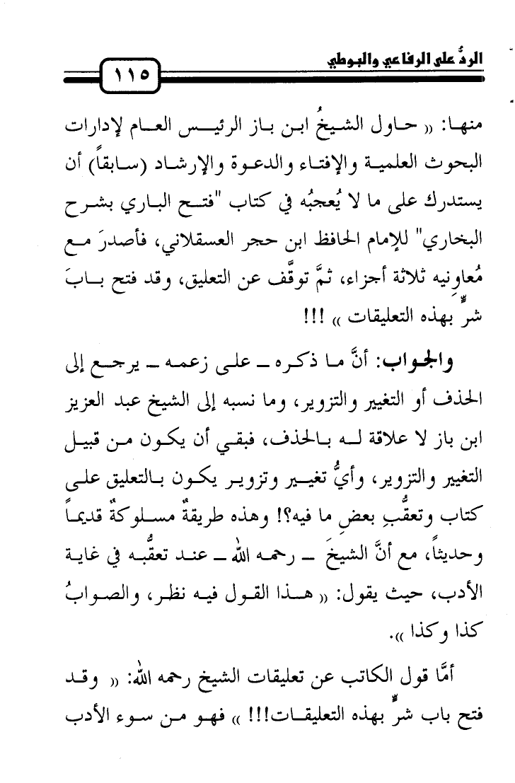 والجواب: أنَّ ما ذكره على زعمه يرجع إلى الحذف أو التغيير والتزوير، وما نسبه إلى الشيخ عبد العزيز ابن باز لا علاقة له بالحذف، فبقي أن يكون من قبيل التغيير والتزوير، وأيُّ تغيير وتزوير يكون بالتعليق على كتاب وتعقُّبِ بعضِ ما فيه؟! وهذه طريقةٌ مسلوكةٌ قديماً وحديثاً، مع أنَّ الشيخَ رحمه الله عند تعقُّبه في غاية الأدب، حيث يقول: "هذا القول فيه نظر، والصوابُ كذا وكذا".