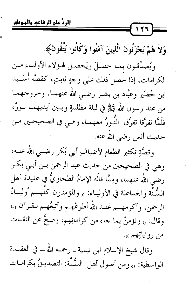 ويُصدِّقون بِما حصلَ ويَحصل لهؤلاء الأولياء من الكرامات، إذا حصل ذلك على وجهٍ ثابتٍ، كقصَّة أُسَيد ابن حُضَير وعبَّاد بن بشر رضي الله عنهما، وخروجهما من عند رسول الله صلى الله عليه وسلم في ليلة مظلمةٍ وبين أيديهما نورٌ، فلَمَّا تفرَّقا تفرَّق النُّورُ معهما، وهي في الصحيحين من حديث أنس رضي الله عنه.