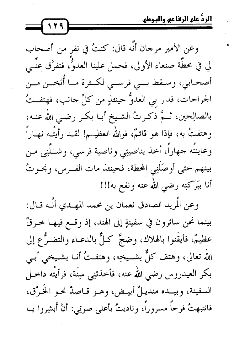 وعن الأمير مرجان أنَّه قال: كنتُ في نفرٍ من أصحاب لي في محطَّة صنعاء الأولى، فحمل علينا العدوُّ، فتفرَّق عنِّي أصحابي، وسقط بي فرسي لكثرة ما أُثخن من الجراحات، فدار بِي العدوُّ حينئذٍ من كلِّ جانب، فهتفتُ بالصالِحين، ثمَّ ذكرتُ الشيخ أبا بكر رضي الله عنه، وهتفتُ به، فإذا هو قائمٌ، فوالله العظيم! لقد رأيتُه نهاراً وعاينتُه جهاراً، أخذ بناصيتِي وناصية فرسي، وشلَّنِي من بينهم حتى أوصَلَنِي المحطة، فحينئذ مات الفرس، ونجوتُ أنا ببَرَكتِه رضي الله عنه ونفع به!!!