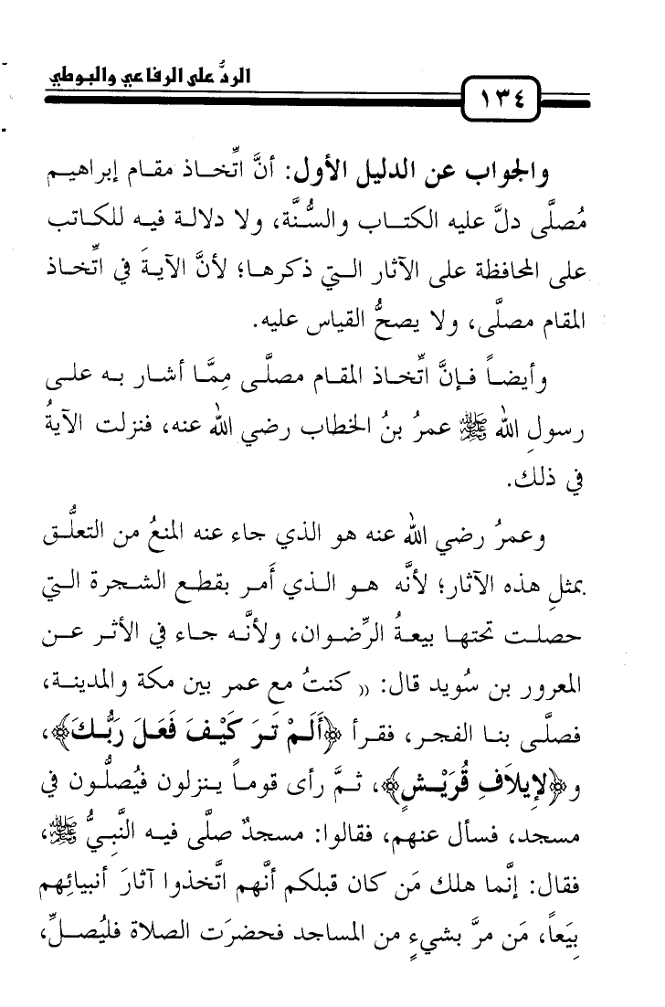 والجواب عن الدليل الأول: أنَّ اتِّخاذ مقام إبراهيم مُصلَّى دلَّ عليه الكتاب والسُّنَّة، ولا دلالة فيه للكاتب على المحافظة على الآثار التي ذكرها؛ لأنَّ الآيةَ في اتِّخاذ المقام مصلَّى، ولا يصحُّ القياس عليه.