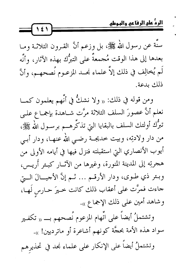 سنَّة عن رسول الله صلى الله عليه وسلم، بل وزعم أنَّ القرون الثلاثة وما بعدها إلى هذا الوقت مُجمعةٌ على التبرُّك بهذه الآثار، وأنَّه لَم يُخالِف في ذلك إلاَّ علماء نجد المزعوم نُصحهم، وأنَّ ذلك بدعة.