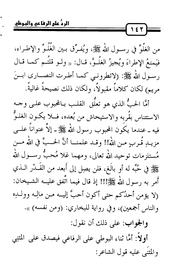 أمَّا الحبُّ الذي هو تعلُّق القلب بالمحبوب على وجه الاستئناس بقُربِه والاستيحاش من بُعده، فلا يكون الغلوُّ فيه عندما يكون المحبوب رسول الله صلى الله عليه وسلم إلاَّ عنواناً على مزيدِ قُربٍ من الله!! وقد علمنا أنَّ الحبَّ في الله من مُستلزمات توحيد الله تعالى، ومهما غلا مُحبُّ رسول الله صلى الله عليه وسلم في حُبِّه له أو بالَغ، فلن يصِل إلى أَبعد من القَدْر الذي أَمر به رسول الله صلى الله عليه وسلم!!! إذ قال فيما اتَّفق عليه الشيخان: "لا يؤمن أحدُكم حتى أكون أحبَّ إليه من مالِه وولدِه والناس أجمعين"، وفي رواية للبخاري: "ومن نفسه".