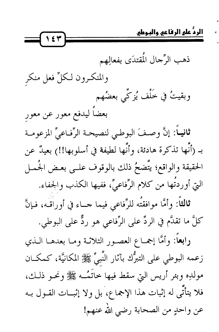 ثالثاً: وأمَّا موافقتُه للرِّفاعي فيما جاء في أوراقه، فإنَّ كلَّ ما تقدَّم في الردِّ على الرِّفاعي هو ردٌّ على البوطي.