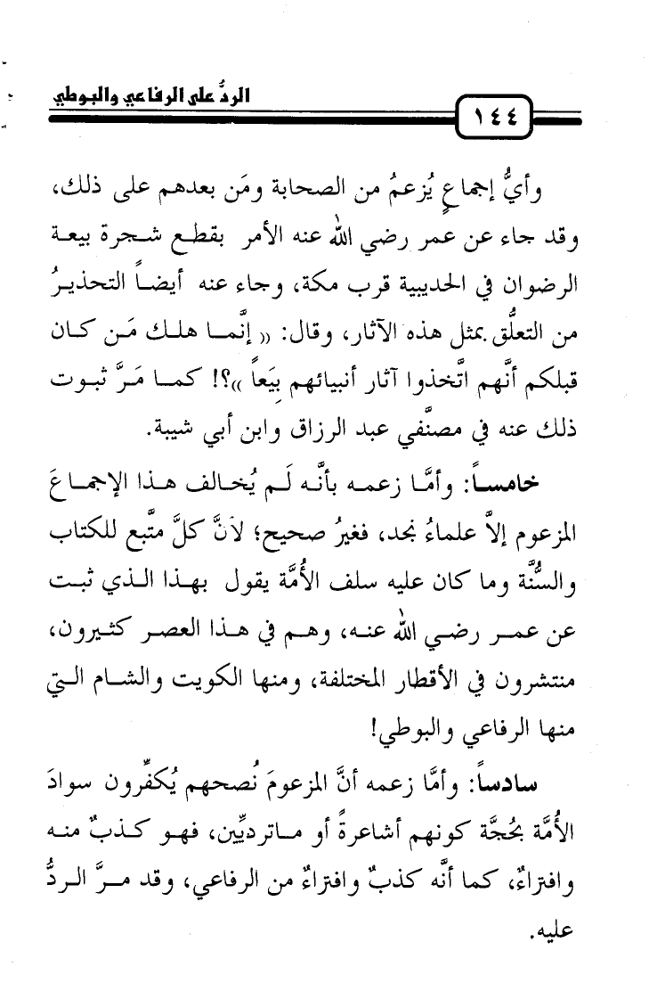 خامساً: وأمَّا زعمه بأنَّه لَم يُخالف هذا الإجماعَ المزعوم إلاَّ علماءُ نجد، فغيرُ صحيح؛ لأنَّ كلَّ متَّبع للكتاب والسُّنَّة وما كان عليه سلف الأُمَّة يقول بهذا الذي ثبت عن عمر رضي الله عنه، وهم في هذا العصر كثيرون، منتشرون في الأقطار المختلفة، ومنها الكويت والشام التي منها الرفاعي والبوطي!