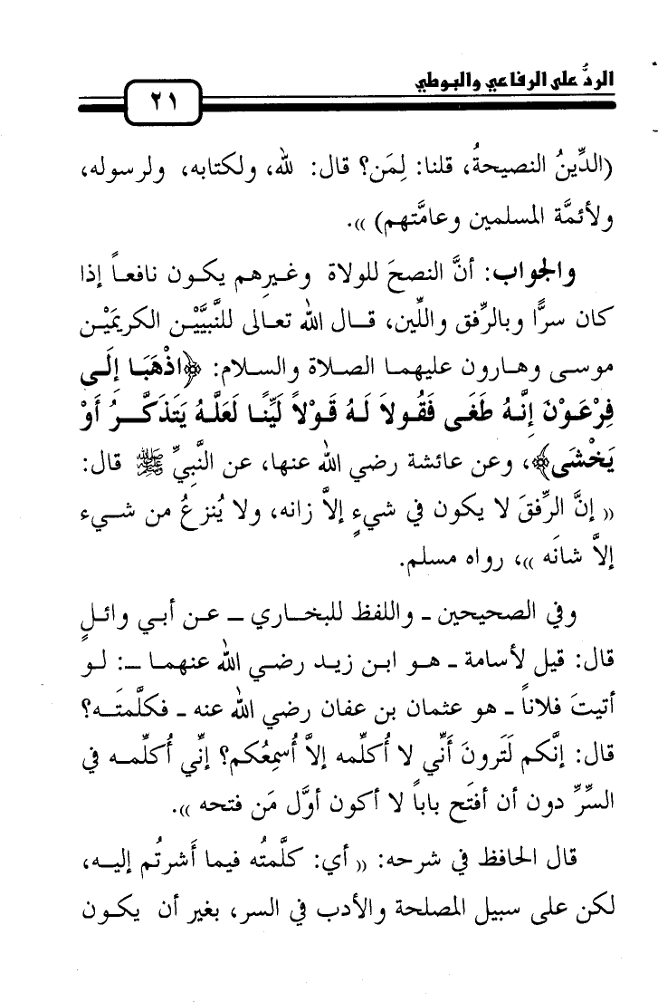 وفي الصحيحين واللفظ للبخاري عن أبي وائلٍ قال: قيل لأسامة هو ابن زيد رضي الله عنهما: لو أتيتَ فلاناً هو عثمان بن عفان رضي الله عنه فكلَّمتَه؟ قال: إنَّكم لَتَرونَ أَنِّي لا أُكلِّمه إلاَّ أُسمِعُكم؟ إنِّي أُكلِّمه في السِّرِّ دون أن أفتَح باباً لا أكون أوَّل مَن فتحه".