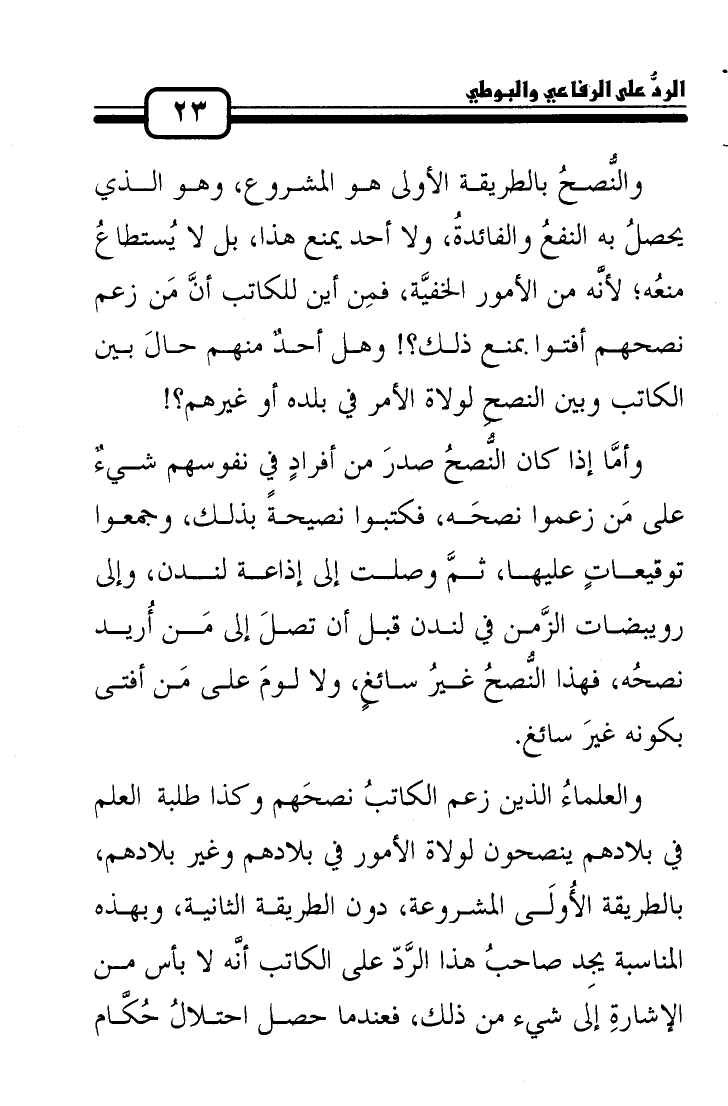 وأمَّا إذا كان النُّصحُ صدرَ من أفرادٍ في نفوسهم شيءٌ على مَن زعموا نصحَه، فكتبوا نصيحةً بذلك، وجمعوا توقيعاتٍ عليها، ثمَّ وصلت إلى إذاعة لندن، وإلى رويبضات الزَّمن في لندن قبل أن تصلَ إلى مَن أُريد نصحُه، فهذا النُّصحُ غيرُ سائغٍ، ولا لومَ على مَن أفتى بكونه غيرَ سائغ.