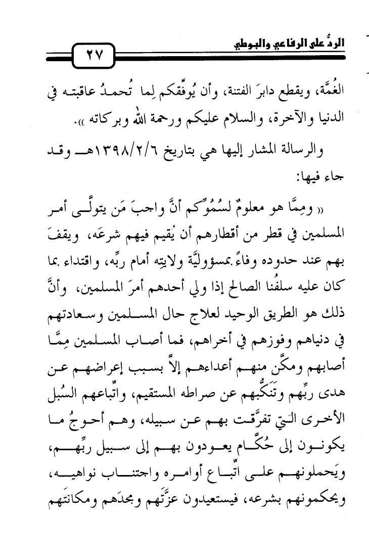 والرسالة المشار إليها هي بتاريخ 6/2/1398هـ وقد جاء فيها: