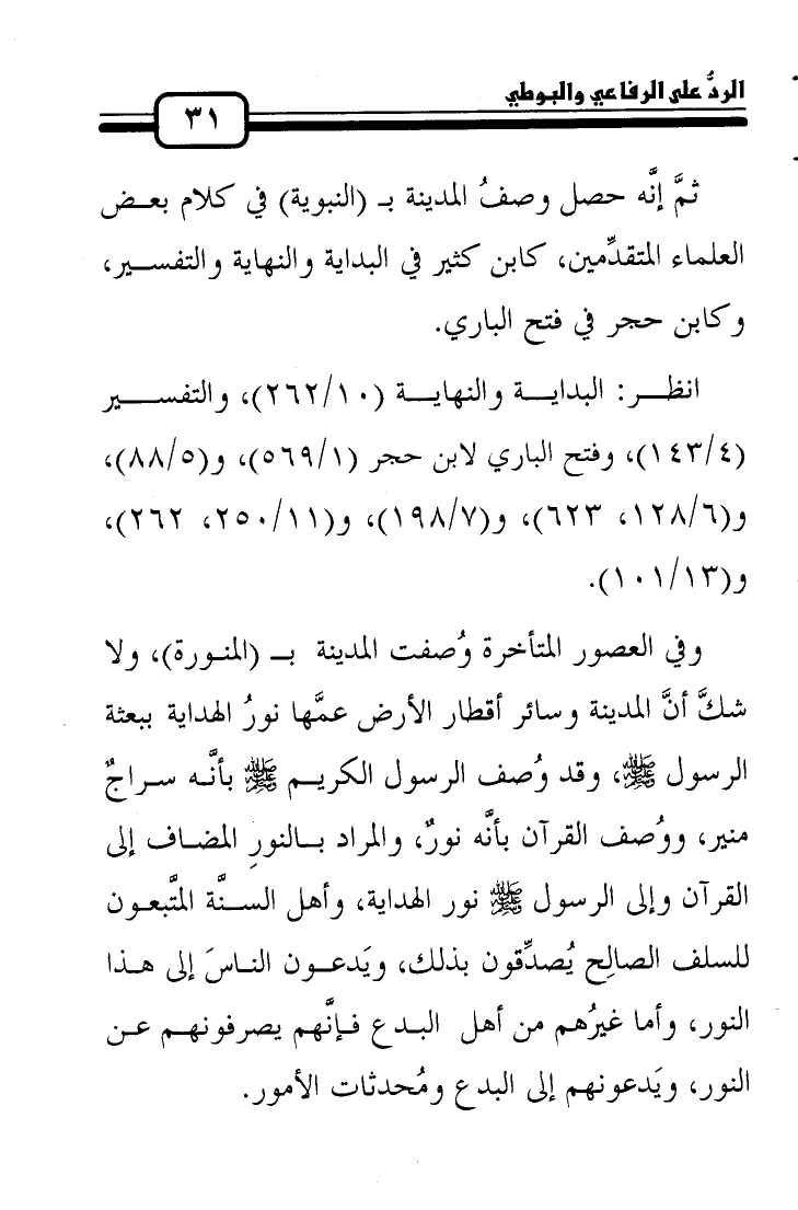 ثمَّ إنَّه حصل وصفُ المدينة ب (النبوية) في كلام بعض العلماء المتقدِّمين، كابن كثير في البداية والنهاية والتفسير، وكابن حجر في فتح الباري.