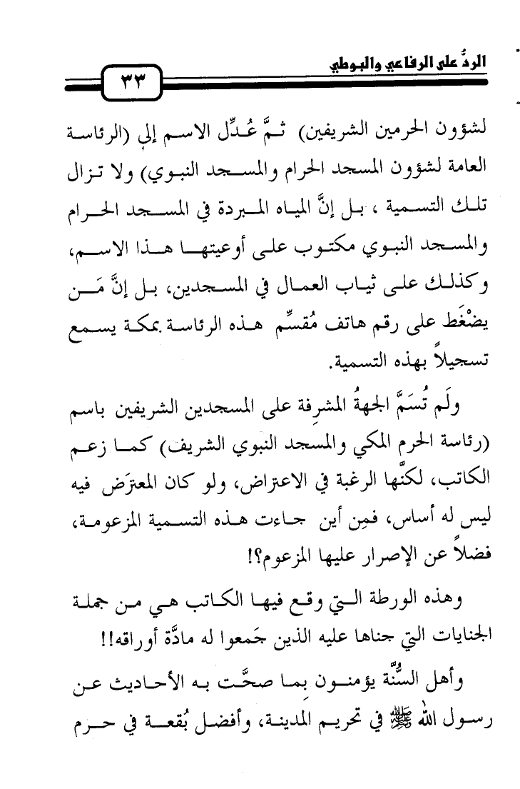 ولَم تُسَمَّ الجهةُ المشرِفة على المسجدين الشريفين باسم (رئاسة الحرم المكي والمسجد النبوي الشريف) كما زعم الكاتب، لكنَّها الرغبة في الاعتراض، ولو كان المعترَض فيه ليس له أساس، فمِن أين جاءت هذه التسمية المزعومة، فضلاً عن الإصرار عليها المزعوم؟!