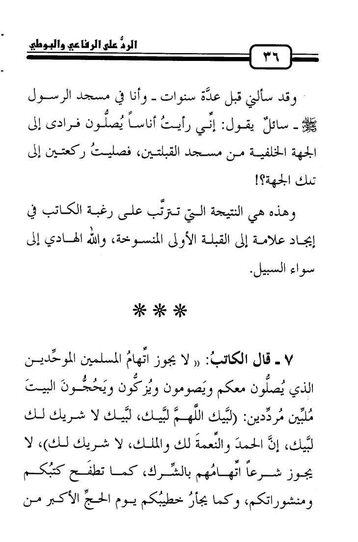 7 قال الكاتبُ: " لا يجوز اتِّهامُ المسلمين الموحِّدين الذي يُصلُّون معكم ويَصومون ويُزكُّون ويَحُجُّونَ البيتَ مُلبِّين مُردِّدين: (لبَّيك اللَّهمَّ لبَّيك، لبَّيك لا شريك لك لبَّيك، إنَّ الحمدَ والنِّعمةَ لك والملك، لا شريك لك) ، لا يجوز شرعاً اتِّهامُهم بالشِّرك، كما تطفَح كتبُكم ومنشوراتكم، وكما يجأرُ خطيبُكم يوم الحجِّ الأكبر من