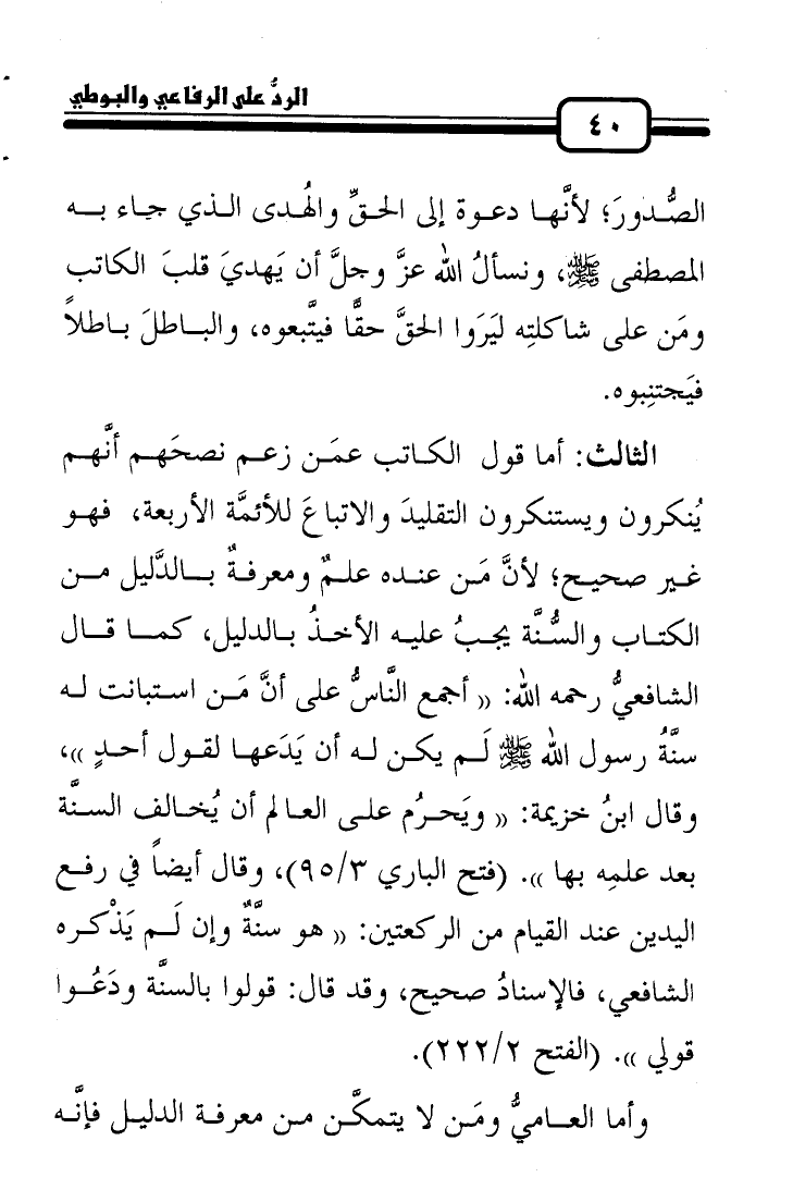 الثالث: أما قول الكاتب عمَن زعم نصحَهم أنَّهم يُنكرون ويستنكرون التقليدَ والاتباعَ للأئمَّة الأربعة، فهو غير صحيح؛ لأنَّ مَن عنده علمٌ ومعرفةٌ بالدَّليل من الكتاب والسُّنَّة يجبُ عليه الأخذُ بالدليل، كما قال الشافعيُّ رحمه الله: "أجمع النَّاسُّ على أنَّ مَن استبانت له سنَّةُ رسول الله صلى الله عليه وسلم لَم يكن له أن يَدَعها لقول أحدٍ"، وقال ابنُ خزيمة: "ويَحرُم على العالم أن يُخالف السنَّة بعد علمِه بها". (فتح الباري 3/95) ، وقال أيضاً في رفع اليدين عند القيام من الركعتين: "هو سنَّةٌ وإن لَم يَذْكره الشافعي، فالإسنادُ صحيح، وقد قال: قولوا بالسنَّة ودَعُوا قولي". (الفتح 2/222) .