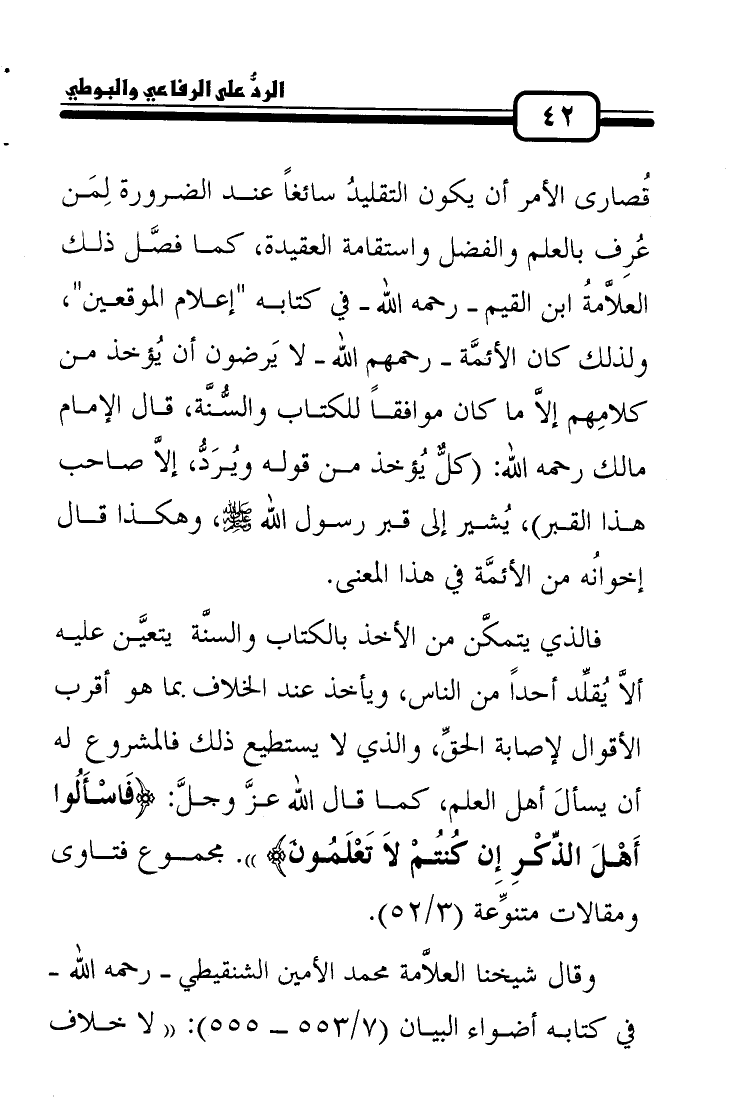 قُصارى الأمر أن يكون التقليدُ سائغاً عند الضرورة لِمَن عُرِف بالعلم والفضل واستقامة العقيدة، كما فصَّل ذلك العلاَّمةُ ابن القيم رحمه الله في كتابه "إعلام الموقعين"، ولذلك كان الأئمَّة رحمهم الله لا يَرضون أن يُؤخذ من كلامِهم إلاَّ ما كان موافقاً للكتاب والسُّنَّة، قال الإمام مالك رحمه الله: (كلٌّ يُؤخذ من قوله ويُرَدُّ، إلاَّ صاحب هذا القبر) ، يُشير إلى قبر رسول الله صلى الله عليه وسلم، وهكذا قال إخوانُه من الأئمَّة في هذا المعنى.
