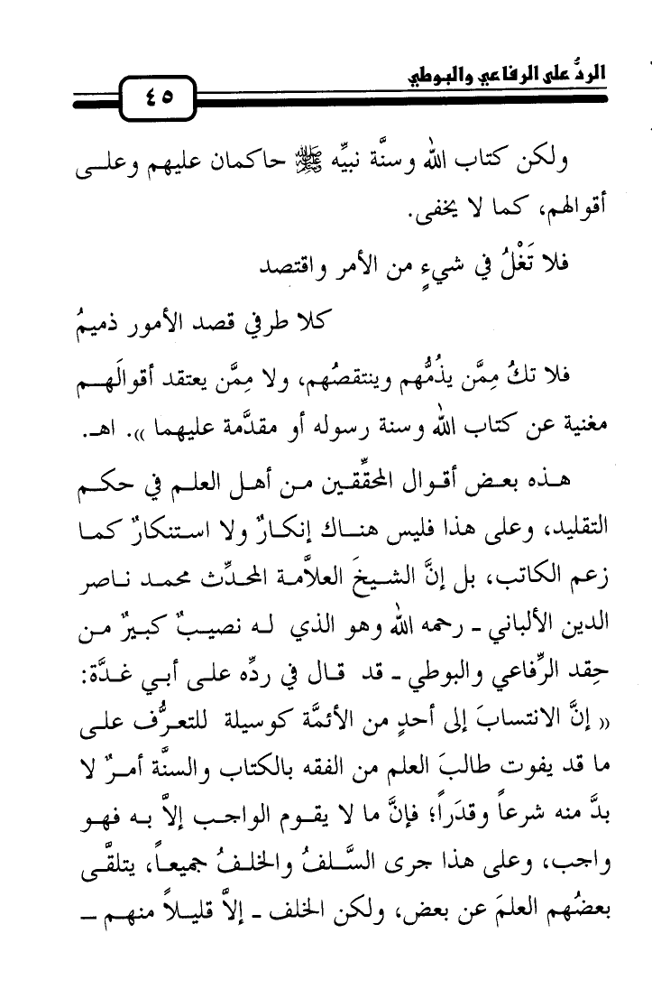 هذه بعض أقوال المحقِّقين من أهل العلم في حكم التقليد، وعلى هذا فليس هناك إنكارٌ ولا استنكارٌ كما زعم الكاتب، بل إنَّ الشيخَ العلاَّمة المحدِّث محمد ناصر الدين الألباني رحمه الله وهو الذي له نصيبٌ كبيرٌ من حِقد الرِّفاعي والبوطي قد قال في ردِّه على أبي غدَّة: