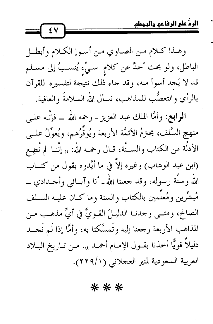 الرابع: وأمَّا الملك عبد العزيز رحمه الله فإنَّه على منهج السَّلف، يحترمُ الأئمَّة الأربعة ويُوقِّرُهم، ويُعوِّلُ على الأدلَّة من الكتاب والسنَّة، قال رحمه الله: "إنَّنا لم نُطِع (ابن عبد الوهاب) وغيره إلاَّ في ما أيَّدوه بقول من كتاب الله وسنَّة رسوله، وقد جعلنا الله أنا وآبائي وأجدادي مُبشِّرين ومُعلِّمين بالكتاب والسنة وما كان عليه السلف الصالح، ومتى وجدنا الدليلَ القويَّ في أيِّ مذهب من المذاهب الأربعة رجعنا إليه وتَمسَّكنا به، وأمَّا إذا لَم نَجد دليلاً قويًّا أخذنا بقول الإمام أحمد". من تاريخ البلاد العربية السعودية لمنير العجلاني (1/229) .
