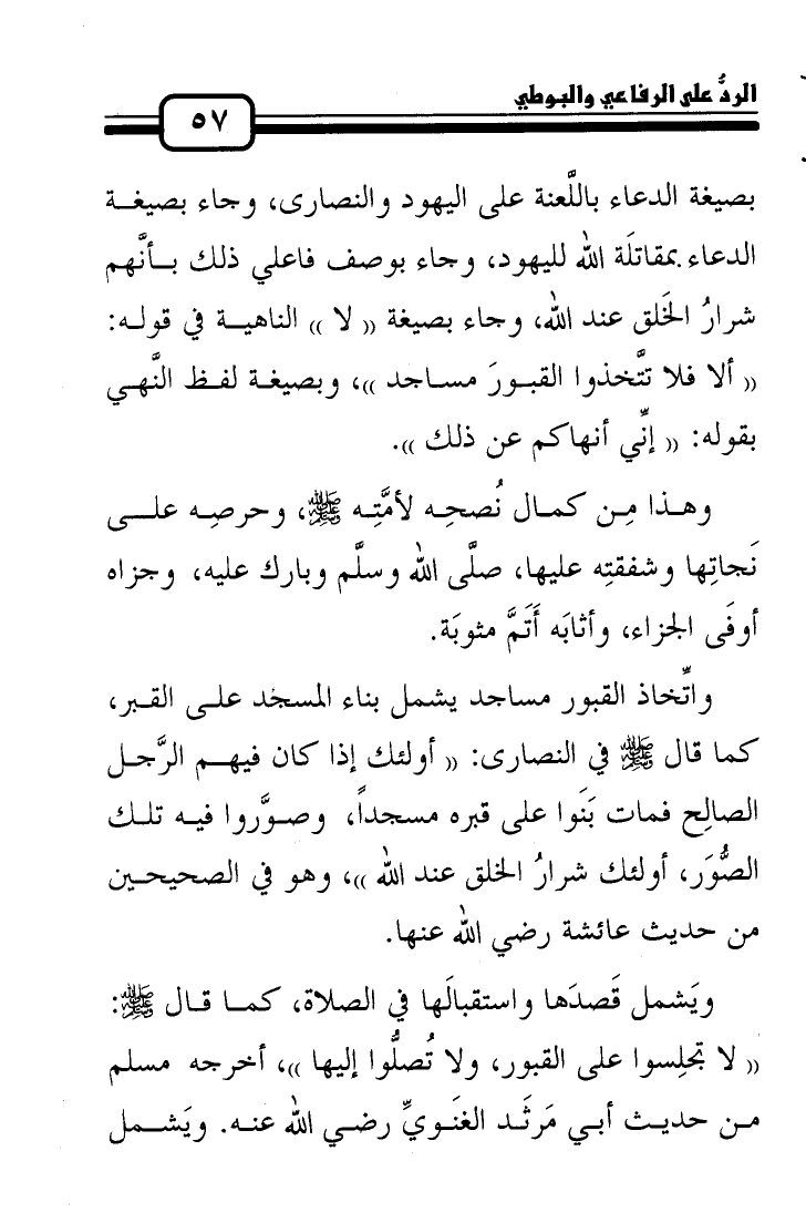 "ألا فلا تتَّخذوا القبورَ مساجد"، وبصيغة لفظ النَّهي بقوله: "إنِّي أنهاكم عن ذلك".
