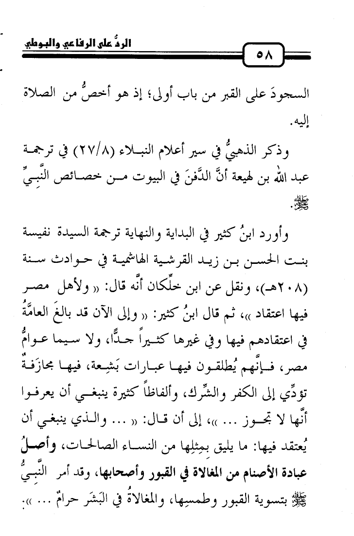 وأورد ابنُ كثير في البداية والنهاية ترجمة السيدة نفيسة بنت الحسن بن زيد القرشية الهاشمية في حوادث سنة (208هـ) ، ونقل عن ابن خلِّكان أنَّه قال: "ولأهل مصر فيها اعتقاد"، ثم قال ابنُ كثير: "وإلى الآن قد بالغَ العامَّةُ في اعتقادهم فيها وفي غيرها كثيراً جدًّا، ولا سيما عوامُّ مصر، فإنَّهم يُطلقون فيها عبارات بَشِعة، فيها مجازَفةٌ تؤدِّي إلى الكفر والشِّرك، وألفاظاً كثيرة ينبغي أن يعرفوا أنَّها لا تجوز ... "، إلى أن قال: " ... والذي ينبغي أن يُعتقد فيها: ما يليق بِمِثلِها من النساء الصالحات، وأصلُ عبادة الأصنام من المغالاة في القبور وأصحابها، وقد أمر النَّبِيُّ صلى الله عليه وسلم بتسوية القبور وطمسِها، والمغالاةُ في البَشَر حرامٌ ... ".
