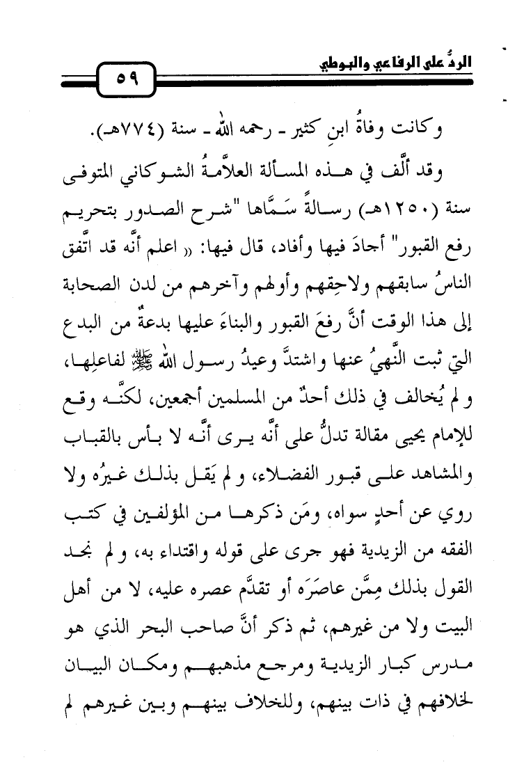 وقد ألَّف في هذه المسألة العلاَّمةُ الشوكاني المتوفى سنة (1250هـ) رسالةً سَمَّاها "شرح الصدور بتحريم رفع القبور" أجادَ فيها وأفاد، قال فيها: "اعلم أنَّه قد اتَّفق الناسُ سابقهم ولاحِقهم وأولهم وآخرهم من لدن الصحابة إلى هذا الوقت أنَّ رفعَ القبور والبناءَ عليها بدعةٌ من البدع التي ثبت النَّهيُ عنها واشتدَّ وعيدُ رسول الله صلى الله عليه وسلم لفاعلِها، ولم يُخالف في ذلك أحدٌ من المسلمين أجمعين، لكنَّه وقع للإمام يحيى مقالة تدلُّ على أنَّه يرى أنَّه لا بأس بالقباب والمشاهد على قبور الفضلاء، ولم يَقل بذلك غيرُه ولا روي عن أحدٍ سواه، ومَن ذكرها من المؤلفين في كتب الفقه من الزيدية فهو جرى على قوله واقتداء به، ولم نجد القول بذلك مِمَّن عاصَرَه أو تقدَّم عصره عليه، لا من أهل البيت ولا من غيرهم، ثم ذكر أنَّ صاحب البحر الذي هو مدرس كبار الزيدية ومرجع مذهبهم ومكان البيان لخلافهم في ذات بينهم، وللخلاف بينهم وبين غيرهم لم