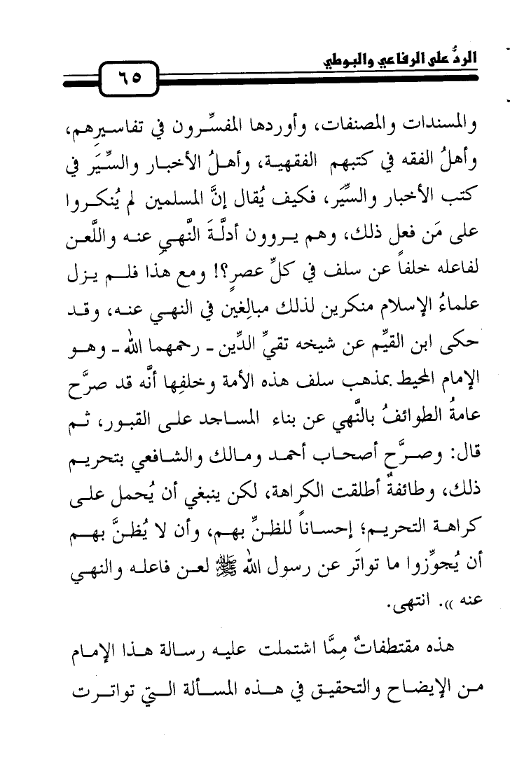 والمسندات والمصنفات، وأوردها المفسِّرون في تفاسيرِهم، وأهلُ الفقه في كتبهم الفقهية، وأهلُ الأخبار والسِّيَر في كتب الأخبار والسِّيَر، فكيف يُقال إنَّ المسلمين لم يُنكروا على مَن فعل ذلك، وهم يروون أدلَّةَ النَّهيِ عنه واللَّعن لفاعله خلفاً عن سلف في كلِّ عصرٍ؟! ومع هذا فلم يزل علماءُ الإسلام منكرين لذلك مبالِغين في النهي عنه، وقد حكى ابن القيِّم عن شيخه تقيِّ الدِّين رحمهما الله وهو الإمام المحيط بمذهب سلف هذه الأمة وخلفِها أنَّه قد صرَّح عامةُ الطوائفُ بالنَّهي عن بناء المساجد على القبور، ثم قال: وصرَّح أصحاب أحمد ومالك والشافعي بتحريم ذلك، وطائفةٌ أطلقت الكراهة، لكن ينبغي أن يُحمل على كراهة التحريم؛ إحساناً للظنِّ بهم، وأن لا يُظنَّ بهم أن يُجوِّزوا ما تواتَر عن رسول الله صلى الله عليه وسلم لعن فاعله والنهي عنه". انتهى.