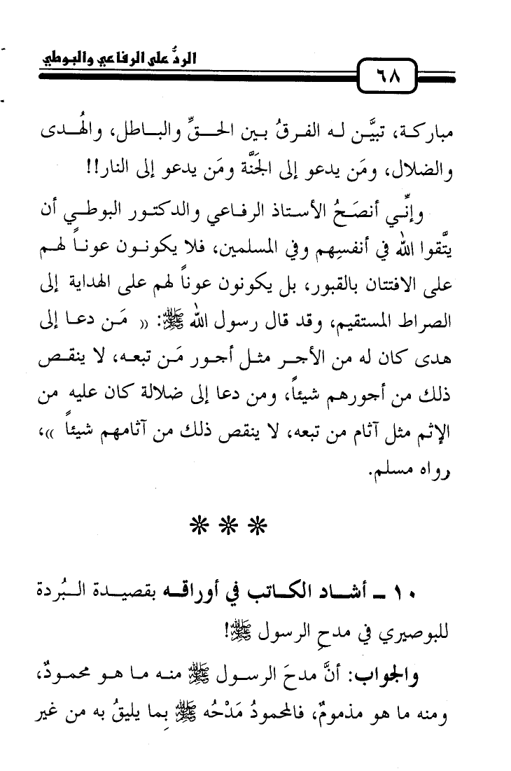 وإنِّي أنصَحُ الأستاذ الرفاعي والدكتور البوطي أن يتَّقوا الله في أنفسِهم وفي المسلمين، فلا يكونون عوناً لهم على الافتتان بالقبور، بل يكونون عوناً لهم على الهداية إلى الصراط المستقيم، وقد قال رسول الله صلى الله عليه وسلم: "مَن دعا إلى هدى كان له من الأجر مثل أجور مَن تبعه، لا ينقص ذلك من أجورهم شيئاً، ومن دعا إلى ضلالة كان عليه من الإثم مثل آثام من تبعه، لا ينقص ذلك من آثامهم شيئاً"، رواه مسلم.