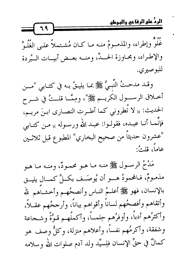 وقد مدحتُ النَّبِيَّ صلى الله عليه وسلم بما يليقُ به في كتابي "من أخلاق الرسول الكريم صلى الله عليه وسلم "، ومِمَّا قلتُ في شرح الحديث: "لا تُطروني كما أطرت النصارى ابنَ مريم، فإنَّما أنا عبده، فقولوا: عبد الله ورسوله" من كتابي "عشرون حديثاً من صحيح البخاري" المطبوع قبل ثلاثين عاماً، قلتُ: