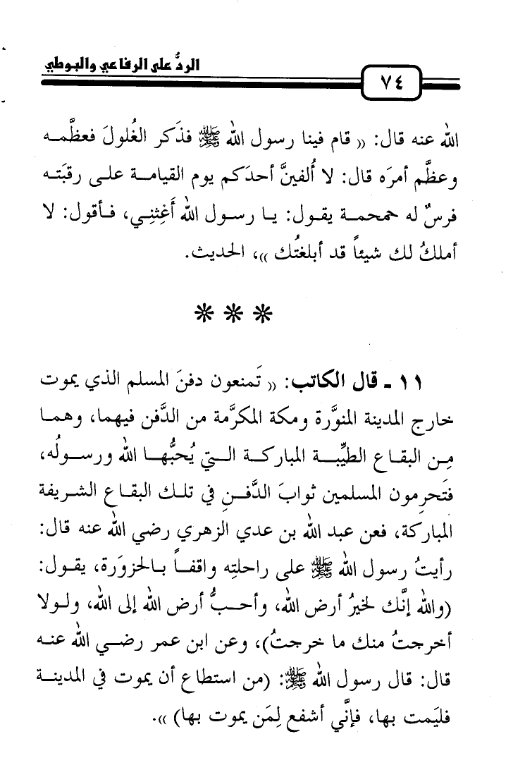 11 قال الكاتب: "تَمنعون دفنَ المسلم الذي يموت خارج المدينة المنوَّرة ومكة المكرَّمة من الدَّفن فيهما، وهما مِن البقاع الطيِّبة المباركة التي يُحبُّها الله ورسولُه، فتَحرِمون المسلمين ثوابَ الدَّفنِ في تلك البقاع الشريفة المباركة، فعن عبد الله بن عدي الزهري رضي الله عنه قال: رأيتُ رسول الله صلى الله عليه وسلم على راحلتِه واقفاً بالحزوَرة، يقول: (والله إنَّك لخيرُ أرض الله، وأحبُّ أرض الله إلى الله، ولولا أخرجتُ منك ما خرجتُ) ، وعن ابن عمر رضي الله عنه قال: قال رسول الله صلى الله عليه وسلم: (من استطاع أن يموت في المدينة فليَمت بها، فإنَّي أشفع لِمَن يموت بها") .